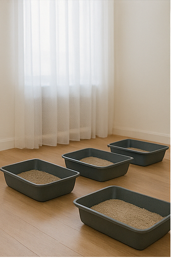 Η νέα άμμος μπαίνει δίπλα στην παλιά για 3–4 ημέρες ώστε η γάτα να επιλέξει.